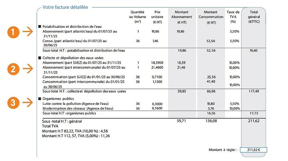 Votre facture est éditée par Véolia EAU, prestataire retenu par Atlantic'eau pour exploiter le réseau potable. Une première facture est envoyée en juillet et une deuxième en décembre.