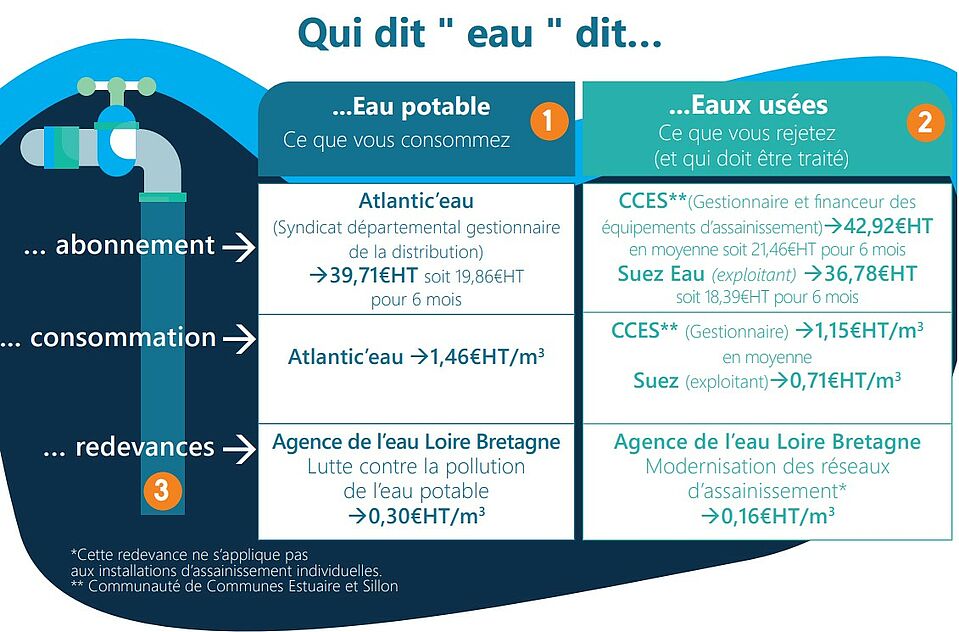Abonnement | ATLANTIC'EAU (syndicat départemental gestionnaire de la distribution) ⇒ 39,71€ HT soit 19,86€ pour 6 mois | CCES* (gestionnaire et financeur des équipements d'assainissement) ⇒ 42,92€ HT en moyenne soit 21,46€ pour 6 mois SUEZ EAU (exploitant) :⇒ 36,78€ HT soit 18,39€ HT pour 6 mois |