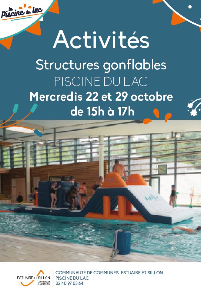 Le22oct. De 15h00 à 17h00 Piscine du Lac de Savenay La Vallée Mabile 44260 Savenay Piscines Structures gonflables à la Piscine du LacAjouter à mon calendrier Fermer PrécédentRetour à la listeSuivant