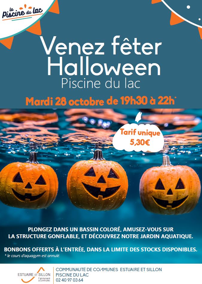 Le28oct. De 19h30 à 22h00 Piscine du Lac de Savenay La Vallée Mabile 44260 Savenay Piscines Venez fêter halloween à la Piscine du LacPlongez dans un bassin coloré, amusez-vous sur la structure gonflable et découvrez notre jardin aquatique.Ajouter à mon calendrier Plongez dans un bassin coloré, amusez-vous sur la structure gonflable et découvrez notre jardin aquatique.Bonbons offerts à l'entrée dans la limite des stocks disponibles.Tarif d'entrée unique : 5,30€NB : le cours d'aquagym est annulé Fermer PrécédentRetour à la listeSuivant